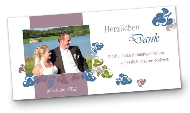 Die Danksagungskarte zur Hochzeit Linda und Bill ist sehr exklusiv und bietet Platz fuer ein grosses Titelfoto, welches von floralen Elementen umgeben wird.