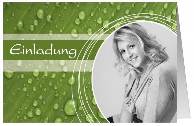 Die Einladungskarte zum Geburtstag "Karola" wurde mit Wassertropfen auf grünen Blättern gestaltet und hat Platz für ein schönes, großes Foto.