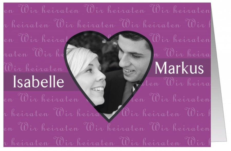 Die Einladungskarte zur Hochzeit "Isabelle & Markus" zeigt das Brautpaar mit einem Foto in Herzform auf der Titelseite und verspricht ein großes Hochzeitsfest. Auf der Innenseite finden Sie ausreichend Platz für Ihren individuellen Einladungstext.