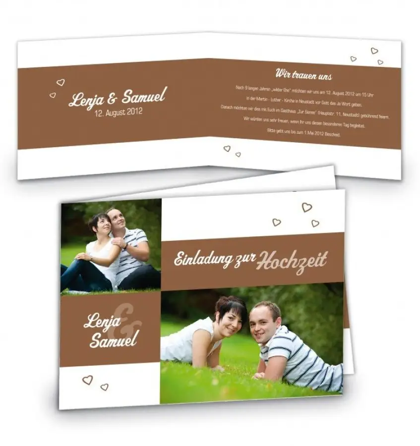Die Einladungskarte zur Hochzeit "Lenja & Samuel" zeigt auf der Außenseite zwei Fotos und auf der Innenseite die Namen des Brautpaares mit Datum im modernen Stil. Auf der Rückseite der Karte kann die Adresse für Rückantwort angegeben werden.