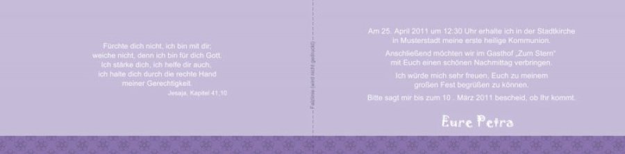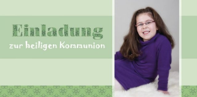 Die Einladungskarte zur Kommunion DIN Lang Petra wurde im eleganten, verspielten Stil gestaltet. Ein Foto Ihres Kindes ist rechts auf der Titelseite zu sehen. Im Inneren haben Sie fuer Ihren Einladungstext und den Kommunionsspruch bzw. Psalm ausreichend Platz. Mit dieser individuellen hochwertigen Klappkarte koennen Sie Freunde, Verwandte und Bekannte zur Kommunion Ihres Kindes einladen. Ihre persoehnlichen Fotos und die passende Farbwahl machen diese Einladungskarte zur Kommunion zu einem individuell gestalteten Unikat in hoher Qualitaet.