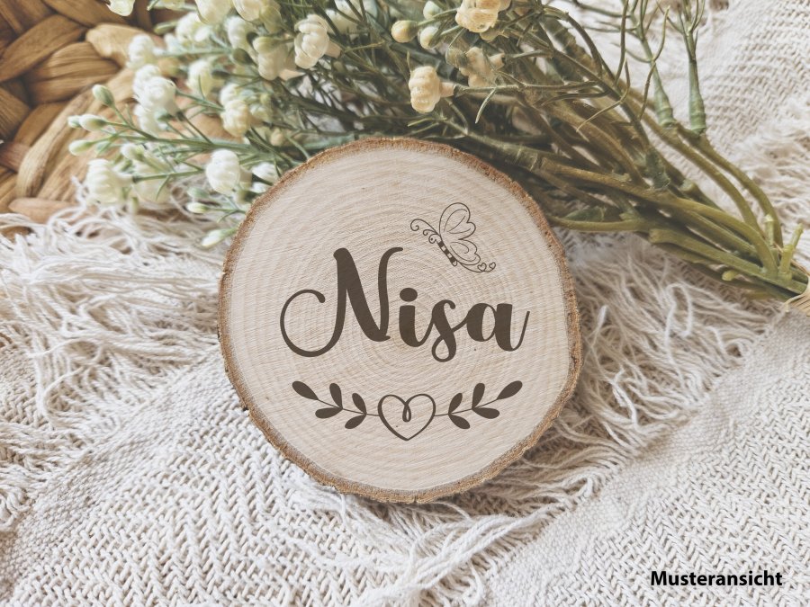Unsere wunderschönen Baumscheiben mit einer indiviuellen Gravur sind genau das Richtige für Naturliebhaber. Das echte Holz mit Rinde hat eine individuelle Maserung und ist ein echter Hingucker durch die individuelle und personalisierte Gravur. Mit unserem professionellen Laser gravieren wir filigrane Grafiken und natürlich deinen Wunschtext.Unsere Baumscheiben sind eine wunderbare Geschenkidee für jeden Anlass, wie z.B. Geburt, Taufe, Kommunion, Konfirmation, Hochzeit und werden durch ihre Personalisierung zu einem einzigartigen Unikat.