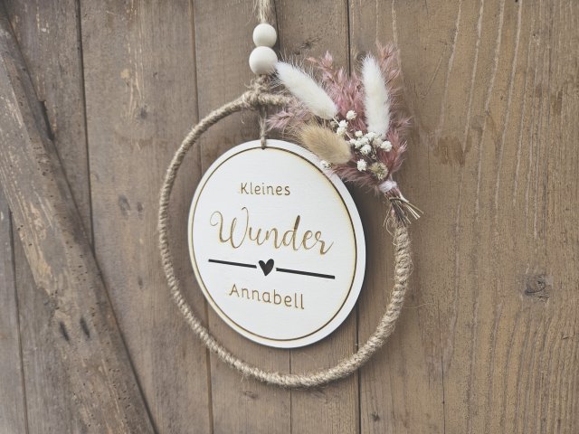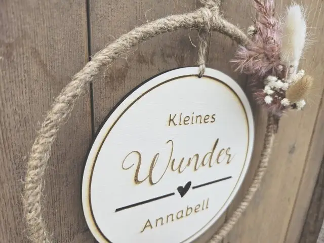 Unsere wunderschön gestalteten Holzschilder mit Jute-Hoop (Tür- und Wandkränze) sind nicht nur einzigartige Wanddekorationen, sondern auch wahre Blickfänge. Mit unserem professionellen Laser gravieren wir filigrane Grafiken und natürlich deinen Wunschtext ganz individuell auf unterschiedlichen Materialien.Unsere Holzschilder sind eine wunderbare Geschenkidee für jeden Anlass, wie z.B. Geburtstag, Geburt, Taufe, Kommunion, Konfirmation, Hochzeit und werden durch ihre Personalisierung zu einem einzigartigen Unikat. Unsere Holzschilder sind in verschiedenen Größen und Materialien erhältlich und können auf Wunsch mit zusätzlichen Trockenblumen in verschiedenen Farben dekoriert werden.