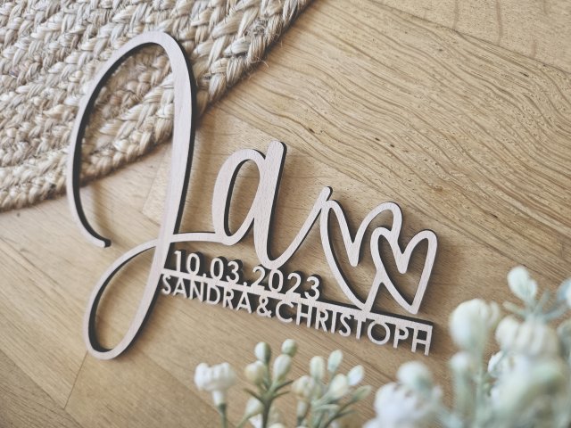 Dieser individuelle Hochzeits Lasercut ist ein wunderschönes Geschenk zur Verlobung oder Hochzeit. Dieses besondere Deko-Accessoire kann in allen Räumen des Hauses aufgehangen werden und ist immer wieder ein toller Blickfang. Für den Laserschnitt kannst du verschiedene Materialien und Größen wählen. Dein individueller Lasercut wird mit unserem professionellen Laser in hoher Qualität hergestellt.Personalisierung